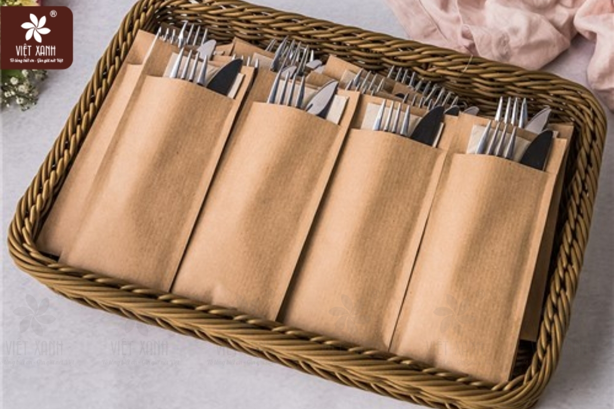 Trong ngành dịch vụ ẩm thực (F&B), sự chuyên nghiệp không chỉ thể hiện qua hương vị món ăn mà còn nằm ở cách nhà hàng chăm sóc trải nghiệm của thực khách. Hiện nay, người tiêu dùng ngày càng khắt khe về vấn đề vệ sinh an toàn thực phẩm và đặc biệt quan tâm đến yếu tố bảo vệ môi trường. Các vật dụng nhựa dùng một lần hay giấy tẩy trắng bằng hóa chất đang dần bị loại bỏ. Thay vào đó, bao đũa kraft với tông màu nâu mộc mạc đã nhanh chóng trở thành một chuẩn mực mới trên các bàn tiệc. Vật dụng này vừa đảm bảo an toàn sức khỏe, vừa giúp doanh nghiệp ghi điểm nhờ thông điệp sống xanh. Để đáp ứng yêu cầu về một bài viết cung cấp thông tin trực diện, rõ ràng nhưng vẫn đảm bảo độ sâu chuyên môn (đạt chuẩn 1300 – 1500 từ theo quy định SEO), nội dung dưới đây sẽ được trình bày dưới dạng phân tích kỹ thuật và hệ thống hóa các bước. Bài viết giúp bạn nắm trọn vẹn ưu điểm của chất liệu kraft, tiêu chuẩn thiết kế tối ưu chi phí và giải pháp cung ứng vật tư đồng bộ đến từ Việt Xanh.
